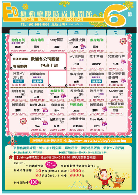 舞動極限是一間結合舞蹈和運動的教室! 我們是一群不分年齡層 熱愛街舞 、有氧瑜珈、肚皮舞和兒童流行舞的朋友 組合而成的一個大家庭 歡迎大家一起來歡樂搖擺、舞動人生! 教室地址:板橋區金門街306號2F 電話:(02)2683-5066